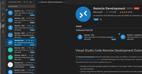 그러면 위에 검생을 할 수 있는데 검색에 Remote Development를 검색한 설치한다.
