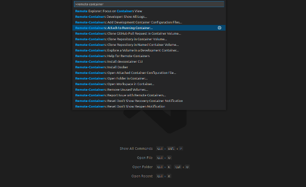 Ctrl + Shift + p를 누르면 여러 명령어들을 볼 수 있는데 remote-Containers:Attach to Running Container를 선택해 준다.