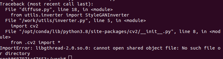 그리고 다시 import cv2를 하면 밑에와 같은 오류와 같이 'libgthread-2.0.so.0:cannot open shared object file'라는 오류가 뜰 때가 있다.
