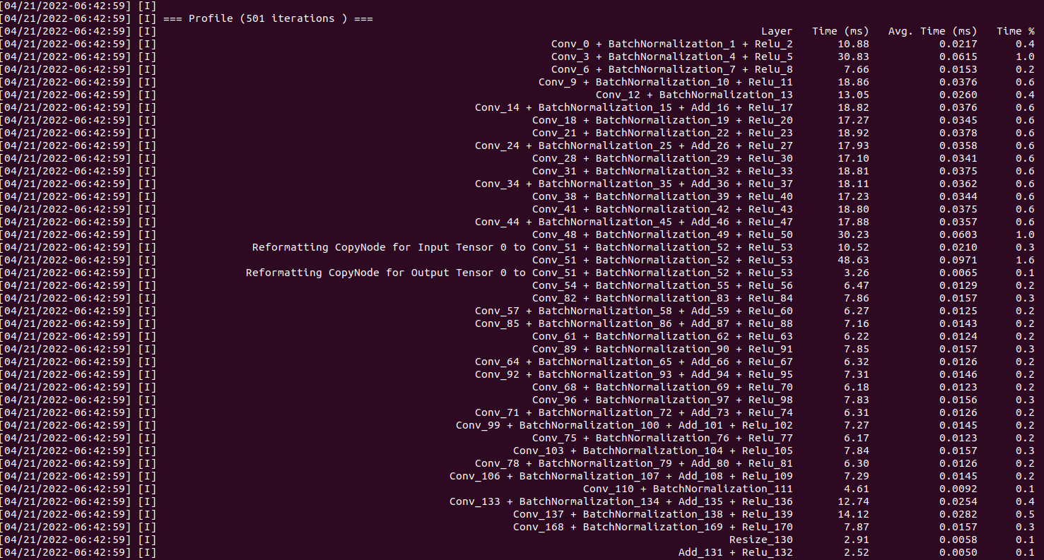 dumpProfile 옵션은 tensorrt 형식으로 변환된 모델에 대해 profile 정보를 출력해 준다고 되어 있는데 option을 추가해서 실행해 보면 모델의 각 layer마다 소요되는 시간에 대해 보여준다.