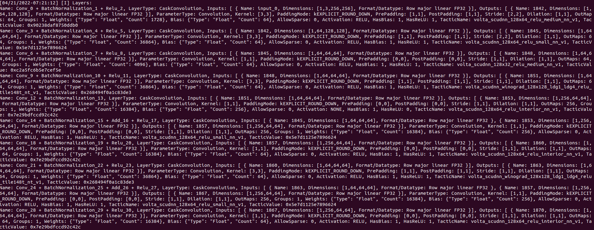 만약, "--profileingVerbosity=detail --dumpLayerInfo" 이렇게 옵션을 추가하였을 경우 다음과 같이 각 layer에 대한 세부 정보가 나온다.