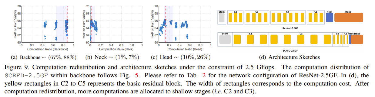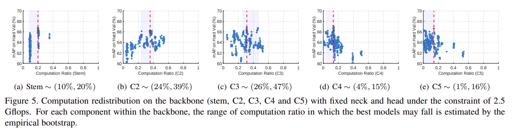 그림 5에서 우리는 모델의 mAP(WIDER FACE hard validation set)의 분포와 backbone의 각 구성 요소(stem, C2, C3, C4, C5)에 대한 computation ratio를 보여준다.