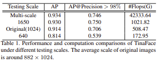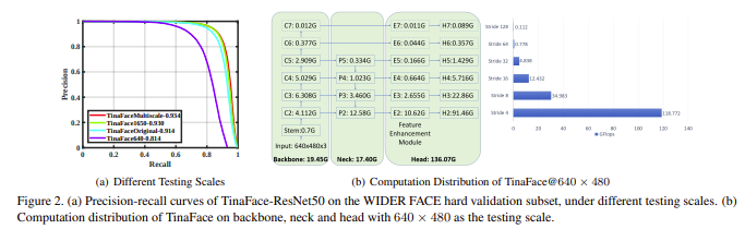 figure 2(a)와 table 1을 보면 여러 test scale에서 TinaFace의 성능을 비교하고 있고, fugure 2(b)는 test image의 scale이 640일 때 backbone, neck, 그리고 head의 component에 대한 TinaFace의 계산 분포를 보여준다. figure 2(b)를 보면 feature map의 resolution이 상당히 큰 stride 4에서 대부분의 computational cost(약 68%)가 발생하고, backbone이나 neck보다 head에서 대부분의 computational cost가 발생한다.