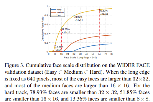 본 논문에서는 WIDER FACE에서 large scale의 test datset을 사용하는 대신 VGA resolution으로 효율적인 Face Detection을 분석한다. VGA resolution으로 하였을 때 WIDER FACE의 대부분의 얼굴(78.93%)은 32 x 32 픽셀보다 작기 때문에 대부분의 얼굴은 shallow stage에서 예측이 된다. 이런 shallow stage에서 더 많은 training sample을 얻기 위해 Sample Redistribution (SR)을 제안한다. 그리고, Face Detector의 구조가 계산 분포를 결정하고 정확도와 효율성을 결정하는 핵심이기 때문에, 다른 flop regimes에서 계산 분포의 원리를 분석한다.