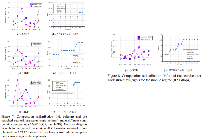 2.5 Gflops의 특정 computation constarint 하에서 backbone 내에서 최적화된 computation distribution을 찾은 후, backbone, neck, 그리고 head 전체에 걸쳐 최적의 computation distribution를 찾는다. 이 단계에서는 backbone setting이 그림 5와 같이 SCRFD1의 computation distribution을 따르는 무작위로 생성된 network configurations만 유지한다.