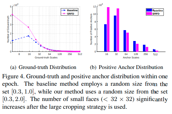 그림 4(a)을 보면 더 많은 sample을 얻을 수 있는 large cropping strategy를 사용한 후 32의 scale보다 더 작은 얼굴을 얻는 것을 볼 수 있다. 비록 large cropping strategy를 사용하면 더 작은 얼굴들을 얻을 수 있지만(예를 들어 4x4보다 작은 얼굴), anchor matching의 실패로 인해 이러한 얼굴은 학습중에 무시된다. 그림 4(b)를 보면, scale이 16과 32일 때 많은 positive anchor를 얻을 수 있는 것을 보여준다. 더 많은 훈련용 샘플이 작은 scale로 재분산되면서, 너무 작지도 않고 적당히 작은 얼굴에 대한 학습을 보다 적절하게 할 수 있다.