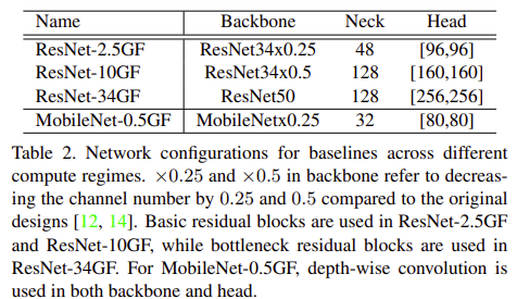 본 논문에서는 target complexity regime에서 qualifying model(2.5 Gflops)을 얻을 때까지 search space에서 random sampling을 반복한다. 그림 9에서는 대부분의 computation은 backbone에 할당되며, 그 다음은 head, 가장 낮은 계산 비율은 neck인 것을 보여준다. 그림 9(d)는 2.5 Gflops의 제약 하에 model architecture를 비교한 것이고, tabel 2는 baseline의 network configuration(ResNet-2.5GF)을 설명한다.