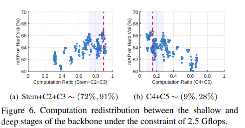 그림 6에서는 backbone의 shallow stage(stem, C2, C3)와 deep stage(C4와 C5) 사이의 계산 비율을 보여준다.
